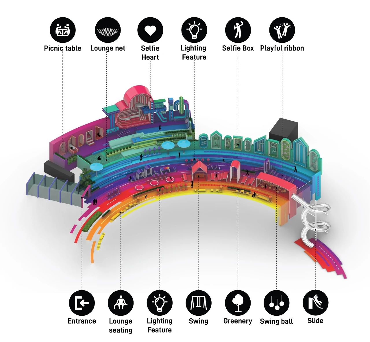 利用屋頂圓弧的造型,設(shè)計(jì)師用不同顏色的彩帶平行地鋪滿地面,增強(qiáng)弧形的視覺(jué)效果,從而形成了一道設(shè)置了多項(xiàng)互動(dòng)活動(dòng)功能的絢麗彩虹。每條彩帶都被賦予了不同的顏色,承載了不同的功能和活動(dòng),通過(guò)休閑與活動(dòng),促進(jìn)社交與互動(dòng)。這些彩帶既作為流線地面二維圖案引導(dǎo)人行動(dòng)線,同時(shí)在局部隆起部分變?yōu)槿S的城市家具、游玩結(jié)構(gòu)與休閑裝置。